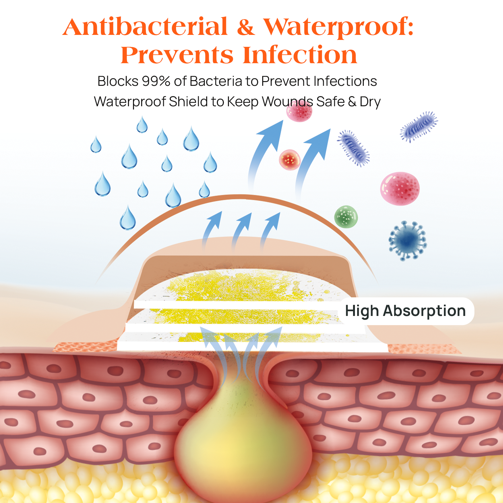 - Advanced Absorption for Faster Healing The 4mm thick foam dressing absorbs wound exudate in just 3 seconds, locking in fluids with the SAF layer to prevent maceration.The unique 5-layer structure evenly distributes exudate to accelerate wound healing by keeping the wound clean and at the optimal moisture level for wound healing while reducing the number of dressing changes.